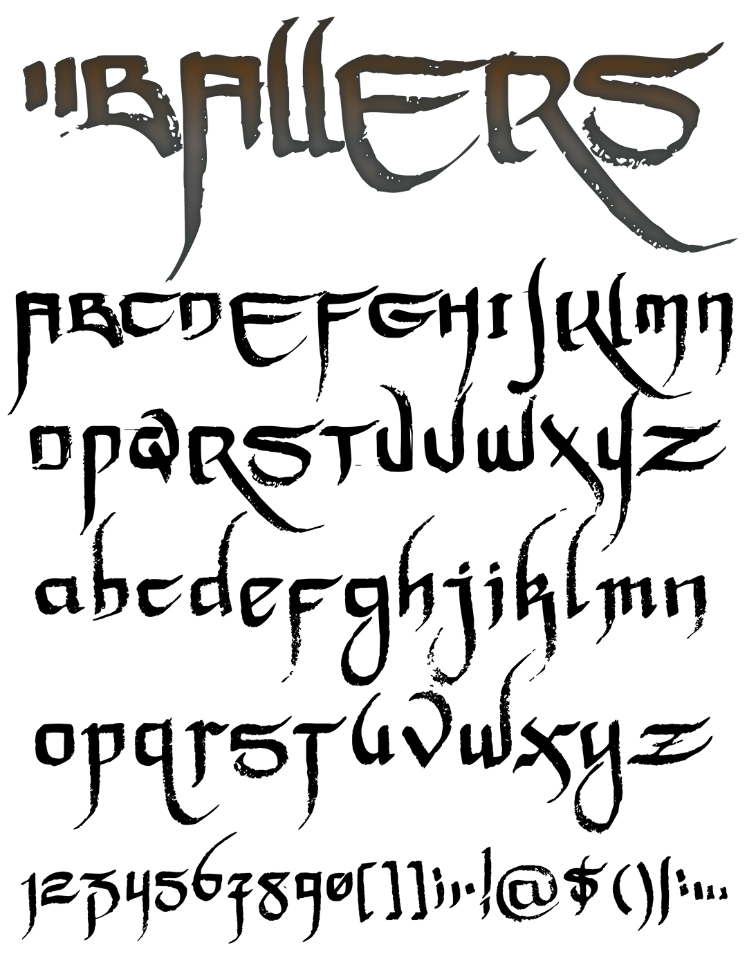 Distressed calligraphic tag lettering in a top aligned, rough brush style. Ballers was created to combine a bit from ancient styles with a bit from modern street styles. 84 hand written characters including uppercase & lowercase letters create a natural & unique style that is easy to read & easy to customize.
