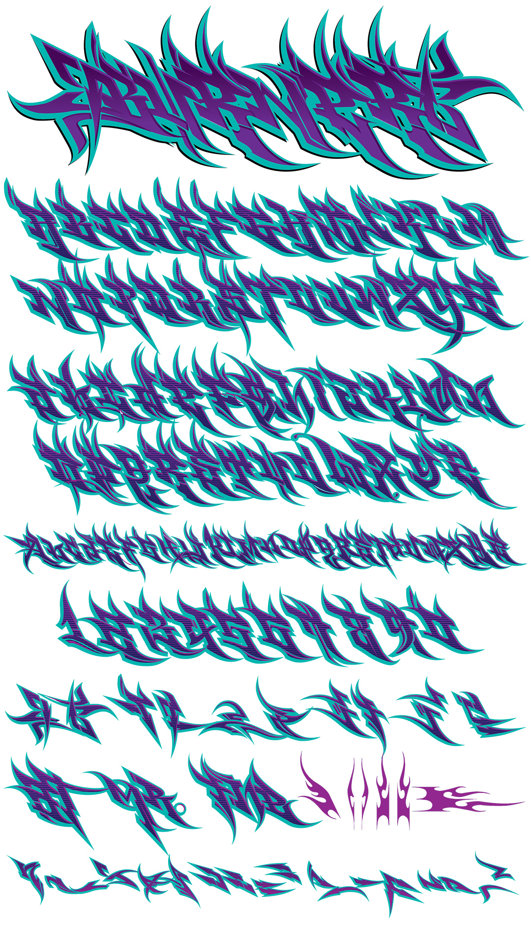 The Burner font family is a layered type system of 155 wildstyle graffiti letters, numbers, symbols & flourishes in each of 5 styles. Glyphs from the fill, outline, fade & detail styles layer & combine in endless combinations to create complex burners that are consistent & legible. Each style contains 3 full alphabets plus initial (beginning) and terminal (ending) glyphs & tons of other embellishments for creating authentic, wildstyle, graffiti pieces with an aggressive & modern look. For even faster access to this family's layering features, the newly developed "Burner Color" style makes use of the new, full-color, vector font capabilities of OpenType & combines all 4 styles layered into a single, color typeface that can be used as-is or broken apart & recolored however you see fit. The Burner graffiti font family was first developed in 2007. It was first widely released as part of the 2009 edition of Graffiti Fonts 4.0 (Codename: BURN) and was only the third wildstyle typeface ever published. Today, the family continues to undergo ongoing development & expansion.