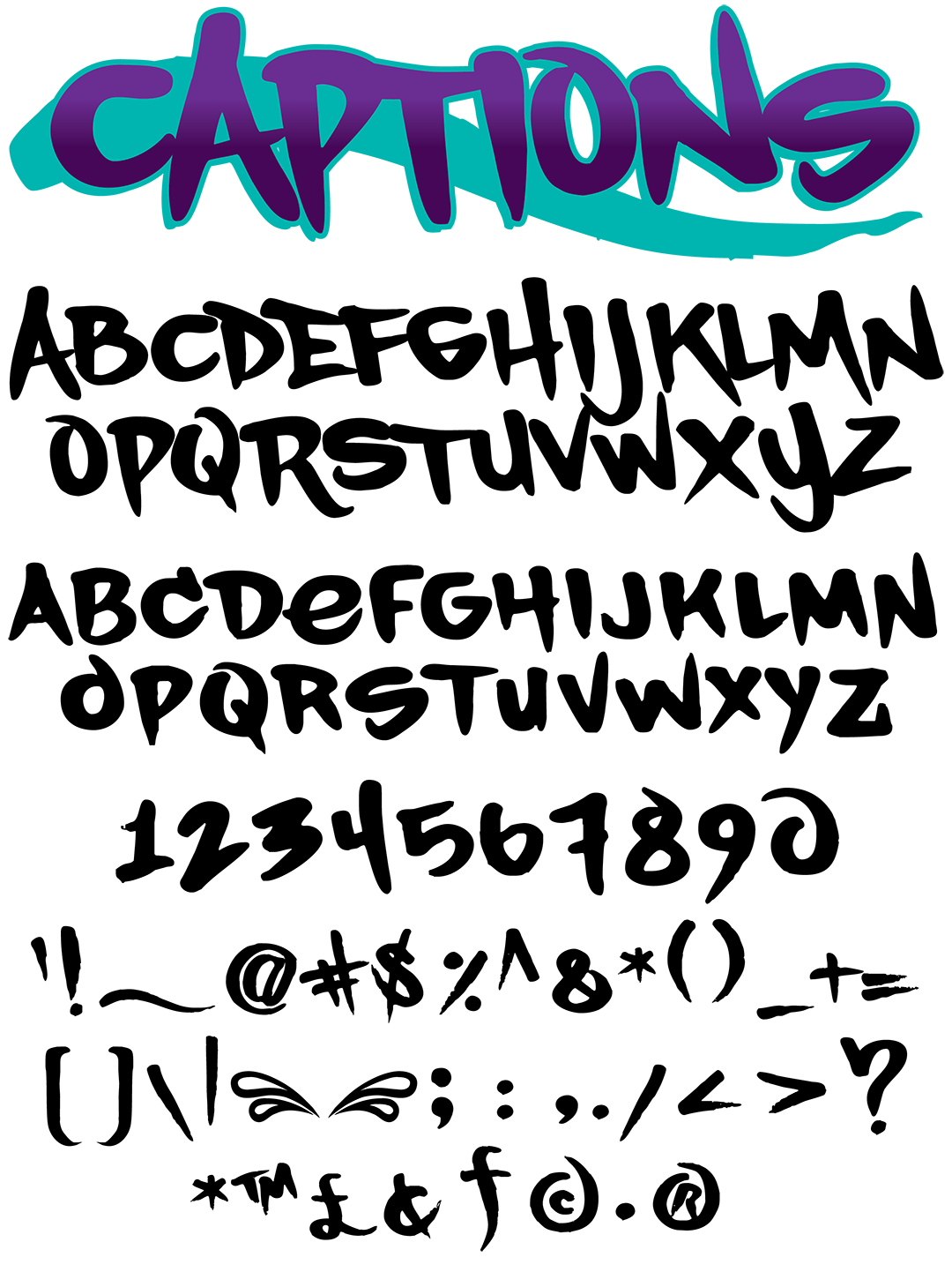 Created to emulate the captions that often accompany full scale, spray paint pieces & productions this simple graffiti style is legible & smooth. The font contains 116 characters including uppercase & lowercase alphabets, numbers, symbols, punctuation, flourishes & dingbats. The original characters were written with a "phantom" (New York Outline Cap) then transferred to ink before digitization. The solid fill & smooth lines make this a versatile, clean & legible style.