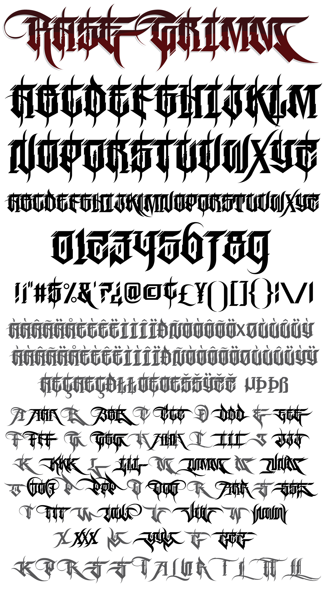 The Grimm family is a blackletter inspired graffiti style built for headline and display. The family includes 3 variants: Grimm Regular & Grimm Curves both utilize traditional capital & lowercase letters while the Grimm Fat variation is an all-caps style. All 3 styles include complete sets of initial, terminal & isolated letter variations as contextual alternates. These alternates allow the beginning and end of any word or phrase to be automatically embellished with specialized characters. Grimm also includes a number of stylistic alternates, standard and discretionary ligatures & other embellishments as well as latin supplement characters for multilingual support & a full array of punctuation and symbols.