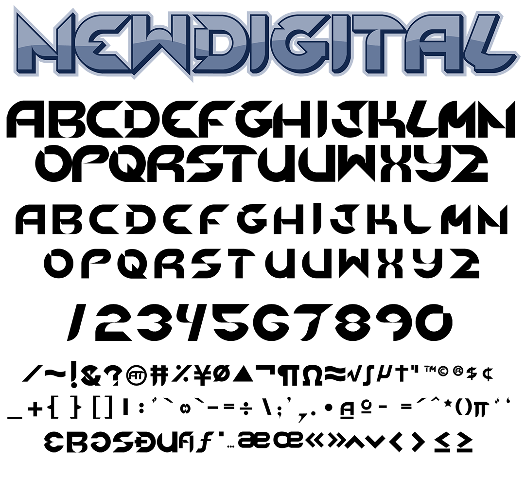 The 222 characters of the "New Digital" typeface were created through the use of an ancient geometric form used to express the golden ratio. We named it "New Digital" because in development the drawings resembled some sort of space-age digital clock. Three styles are included; regular, italic & outline.