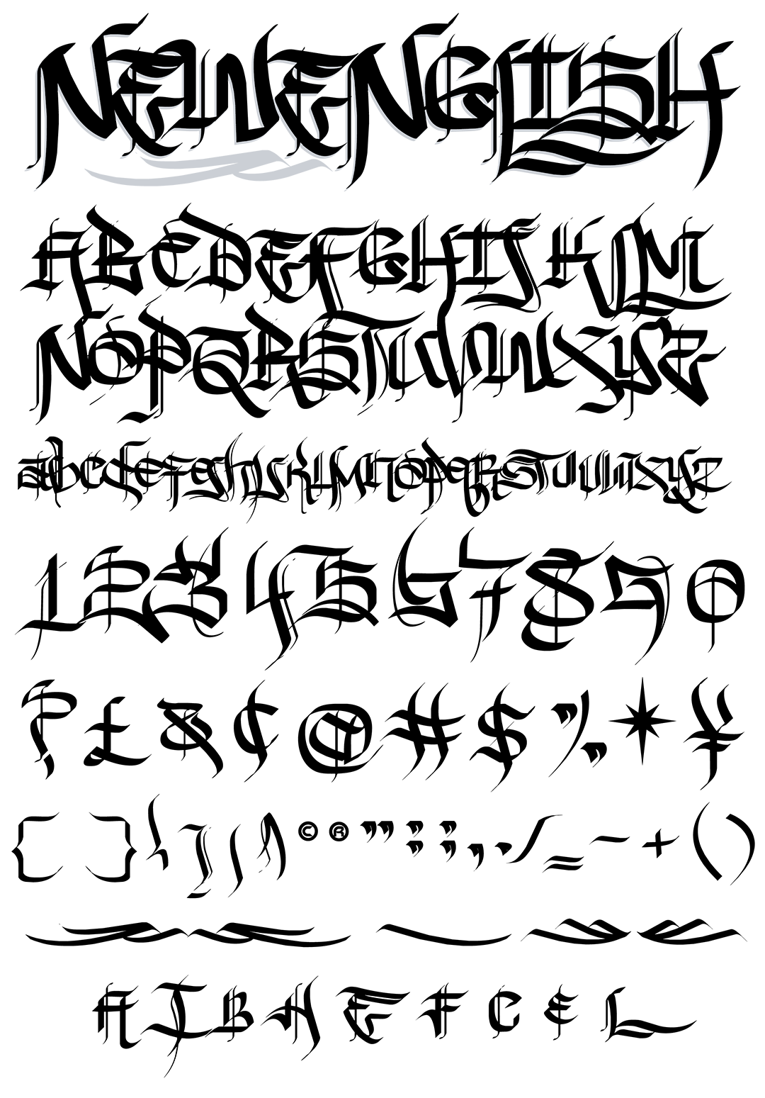 This calligraphic graffiti style is a cross between european blackletter styles & chicano american graffiti & tattoo styles. The fonts was built for customization with lots of alternate letters, flourishes & a full compliment of numbers, symbols & punctuation. 153 characters in all.
