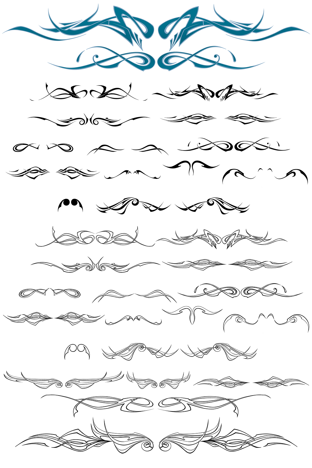 13 individual sets of symmetrical graffiti flourishes resembling tribal decorations. 78 characters in all provide both solid fill styles & offset outline styles for each design. This font is particularly useful in tattoo & clothing design & can be combined effectively with some of our wild style fonts such as "RaseOne" or "WildStyle".