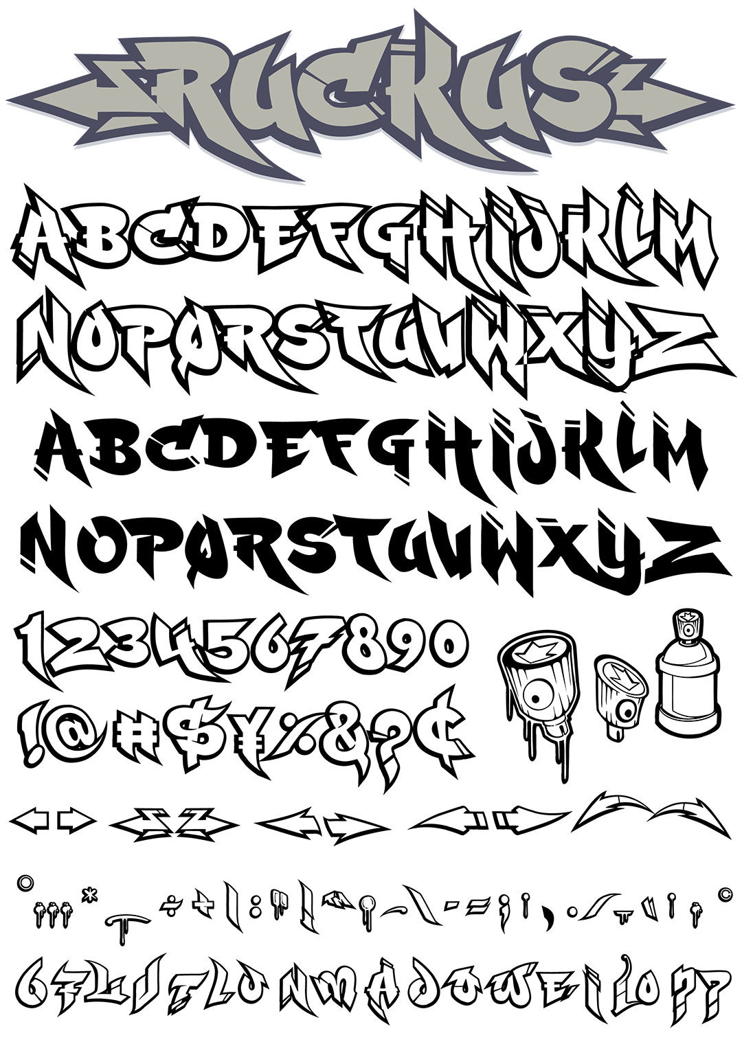 156 characters in a classic graffiti style. Lettering & artwork, numbers, symbols, arrows and more are all included. This typeface features solid fill style letters as well as a thick, crisp outline style which can be layered seamlessly together for a, iconic graffiti look.