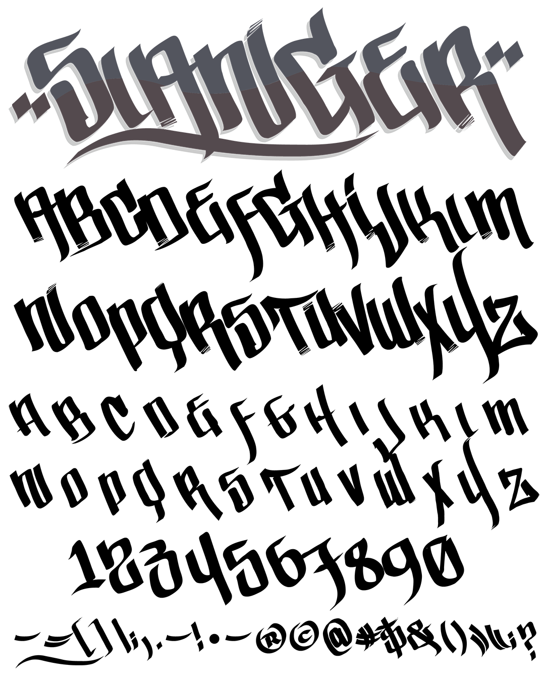 This simple 111 character typeface is modeled loosely after west coast gang writing with a bit of a Hip-Hop slant. The leaned back (reverse italic) letters are rendered in a sharp chisel tip style with smooth lines & just enough irregularity to retain a hand written feel.