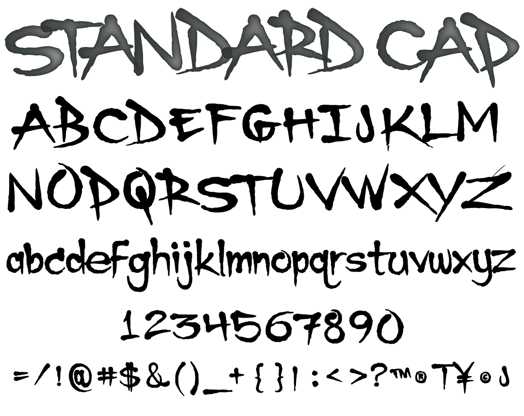 A "Standard Cap" is the cap or "actuator" that comes with your average hardware store spray paint such as Krylon or Rustoleum. These caps release a lot of pressure & have an irregular spray pattern. This font was created to resemble the look of simple tag style writing done with a standard cap. 90 characters in all including uppercase & lowercase alphabets as well as numbers and all the basic punctuation & symbols.