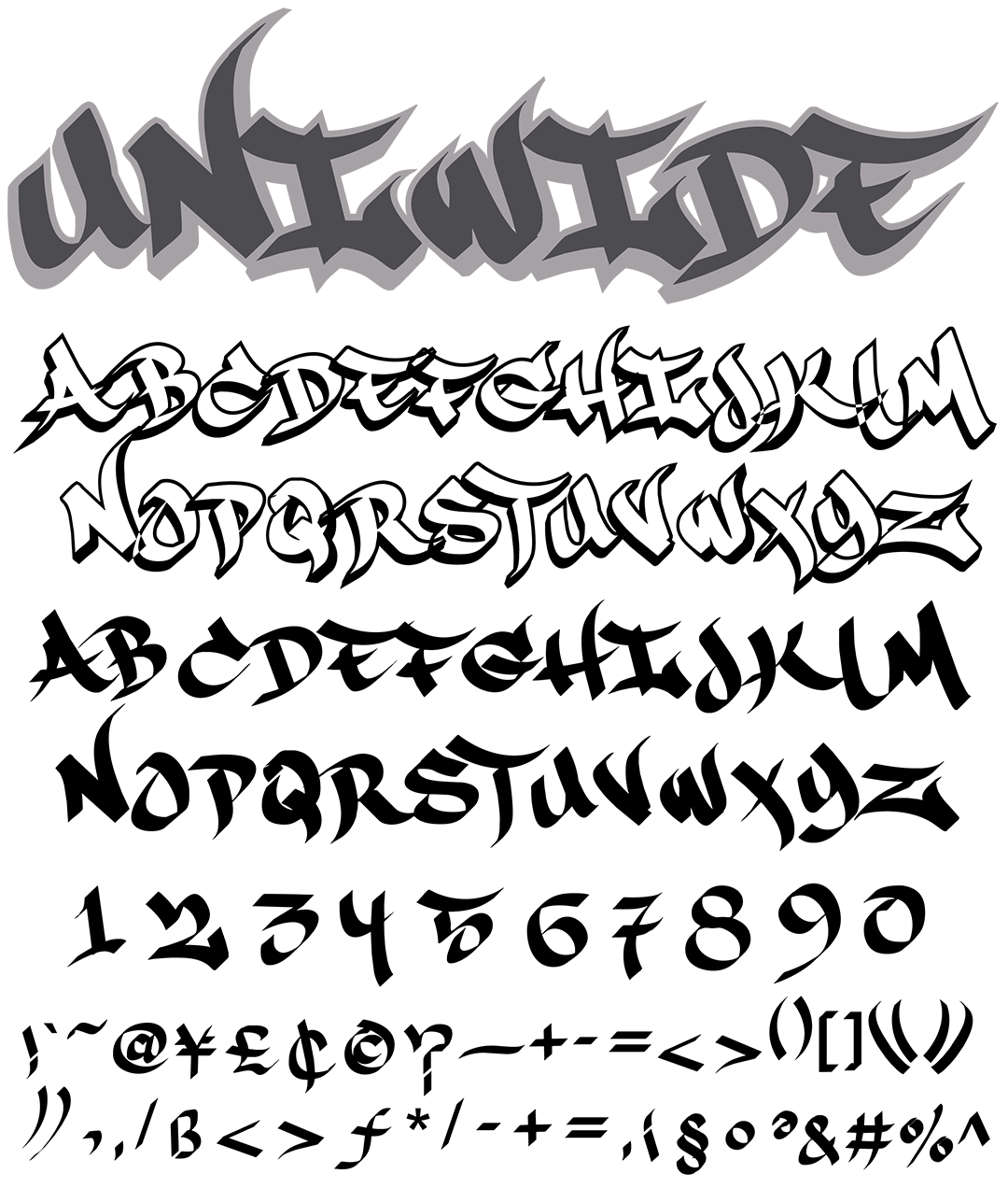 105 Bold & legible tag style characters as written with a "uniwide" marker. This font was digitally recreated from artwork on paper & is derived from the same characters as our "Rapscript" font family. With smooth lines & sharp corners this handstyle was made to work well with thick outlines & includes a custom outline style that can be layered directly over the fill style.